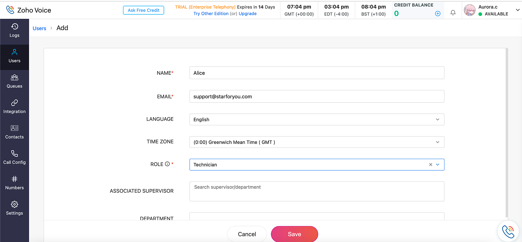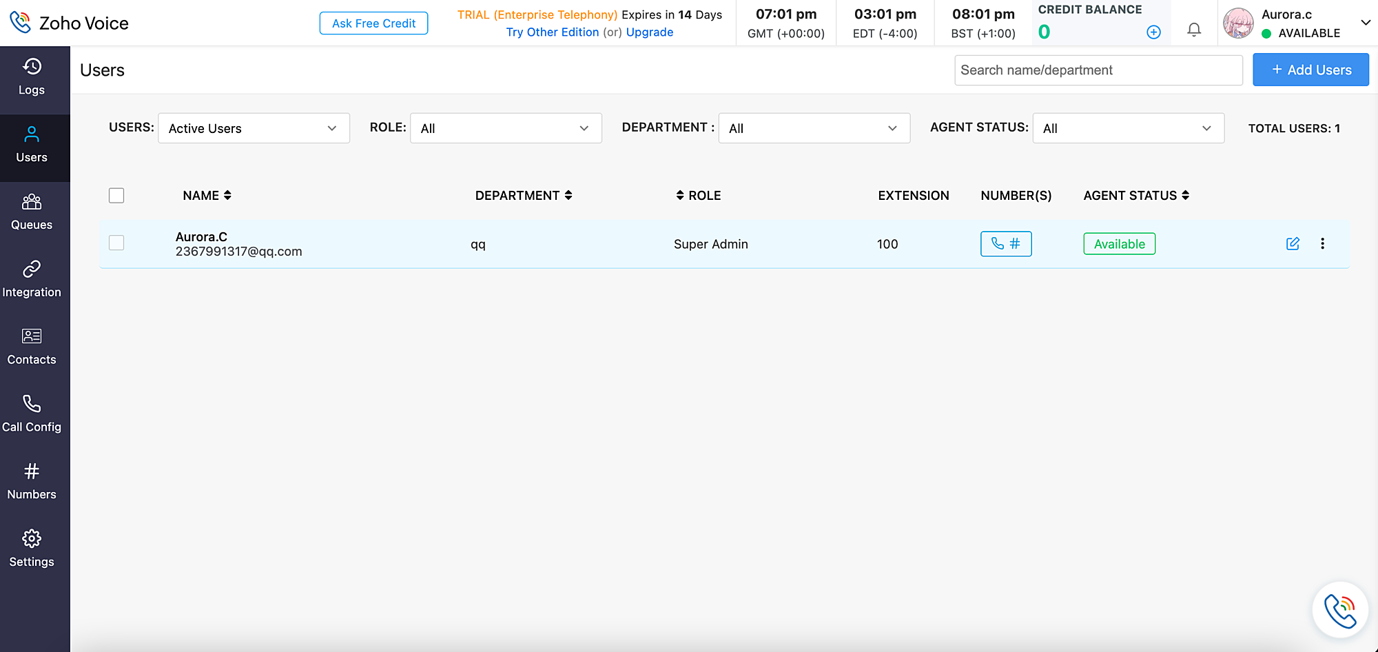 创建帐户后,您就可以开始添加用户。这些用户可以登录 Zoho Voice 并根据他们拥有的权限配置和查看不同的设置。